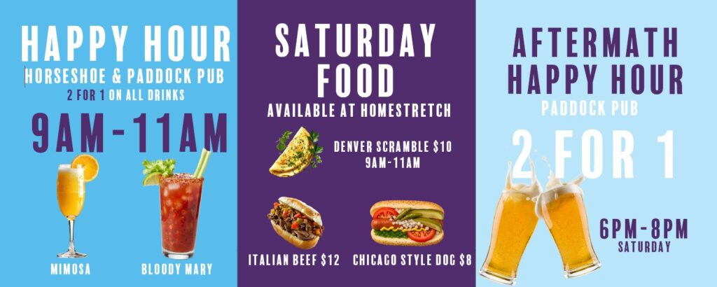 Happy Hour featuring two-for-one drink specials in Paddock Pub (Clubhouse Level) and Horseshoe Bar (Mezz Level).