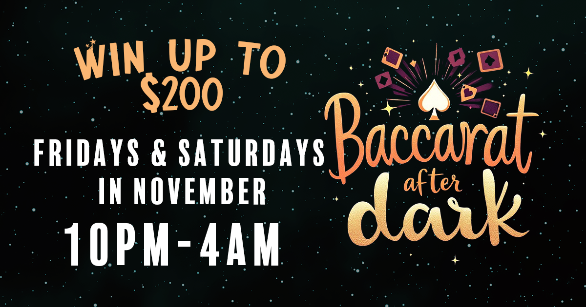 Welcome to Baccarat After Dark, your late-night chance to win instant cash, just for playing with your Rewards card. When you’re in the game, you’re automatically entered into our Bac only Hot Seat drawings. Take your shot. Late night luck is waiting…Only at Baccarat After Dark.
