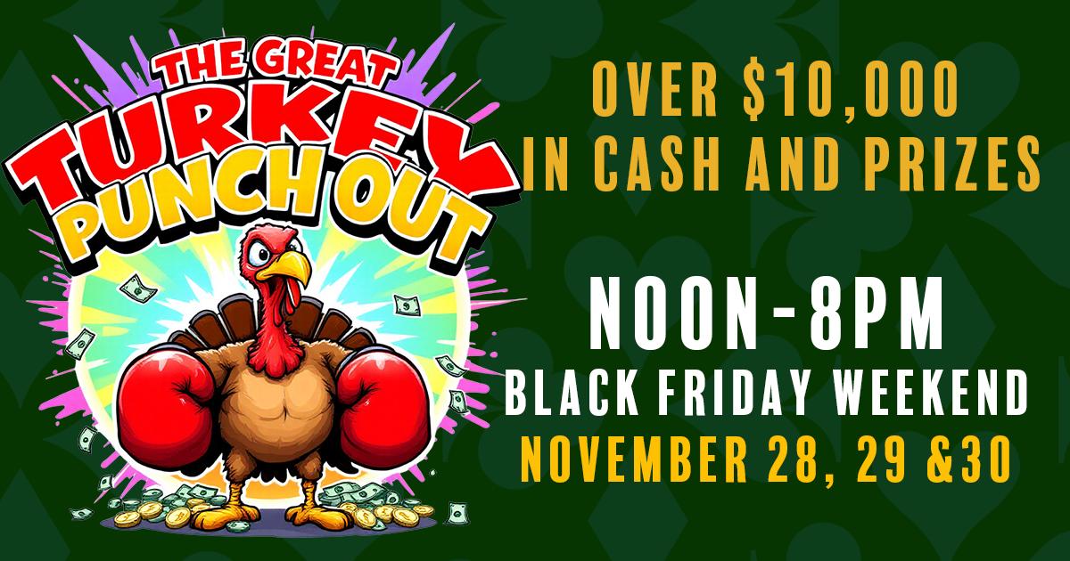 Get ready to gobble up some green! Join us for three days of fun and prizes with our Turkey Punch Out e vent. Every hour, from Noon-8PM, four lucky guests will be drawn for the chance to punch the turkey and win BIG! Be in the hot seat and actively playing table games. If you’re drawn, you’ll get to punch one of 16 holes on the Turkey Punch Board.